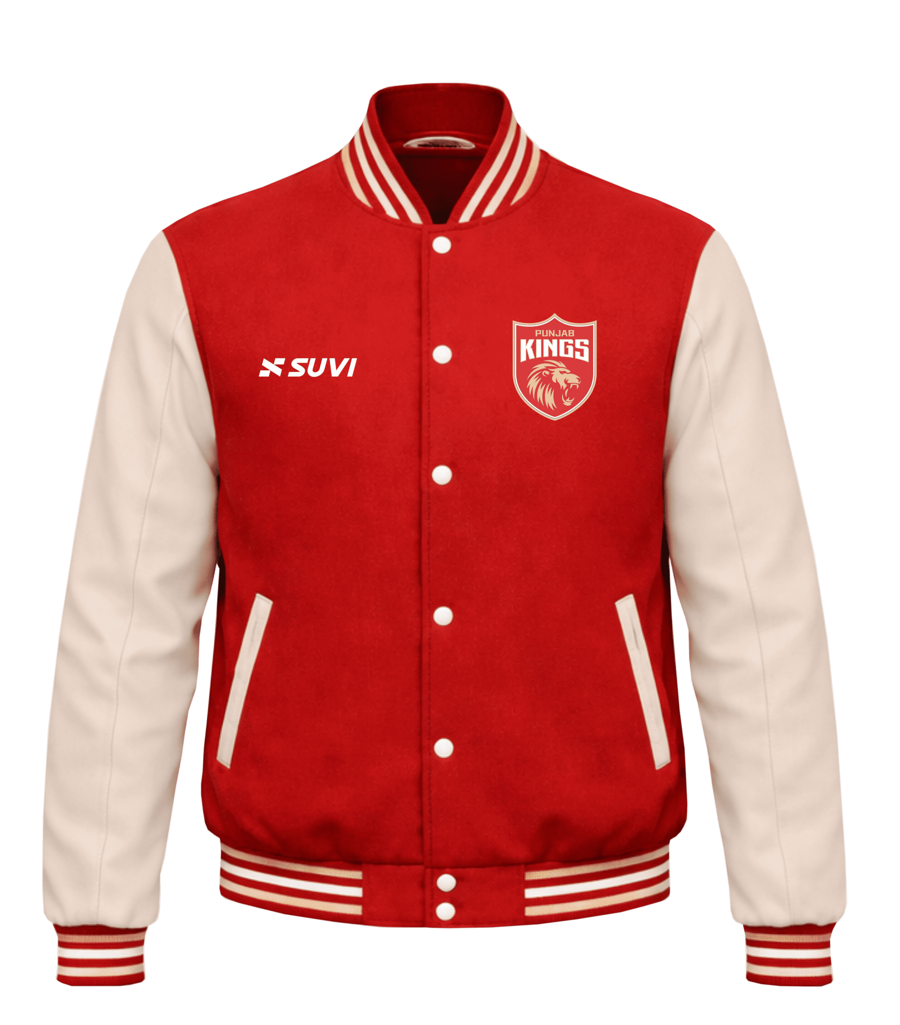 Our Punjab Kings Varsity Jacket is a premium reimagining of the classic collegiate silhouette. Blending old-school varsity aesthetics with a bold, contemporary red-and-cream palette, this jacket is designed for the fans who carry their pride everywhere they go.
